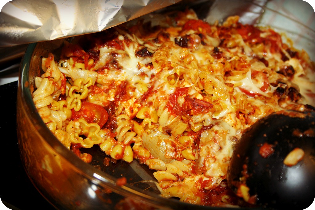 pastagratanggIhop med det gjorde jag en pastagratäng. Idéen till denna föddes när jag hade för mycket minitomater. Det är en perfekt rätt att slänga ihop om man har överblivna oliver, tomater eller pastasås. Koka pastan al dente, varva med tomatsås, basilika och oregano och ev. kött. Jag lade till mozzarella och fetaostkuber samt kronärtskockor. Riktigt lyxigt blir det med lite grädde också, som man häller över. Grädda i 20-30 minuter i 200° och det är klart. Kom ihåg att steka köttet på förhand, om du sätter i sånt. Oliver och soltorkade tomater är också kanongott.