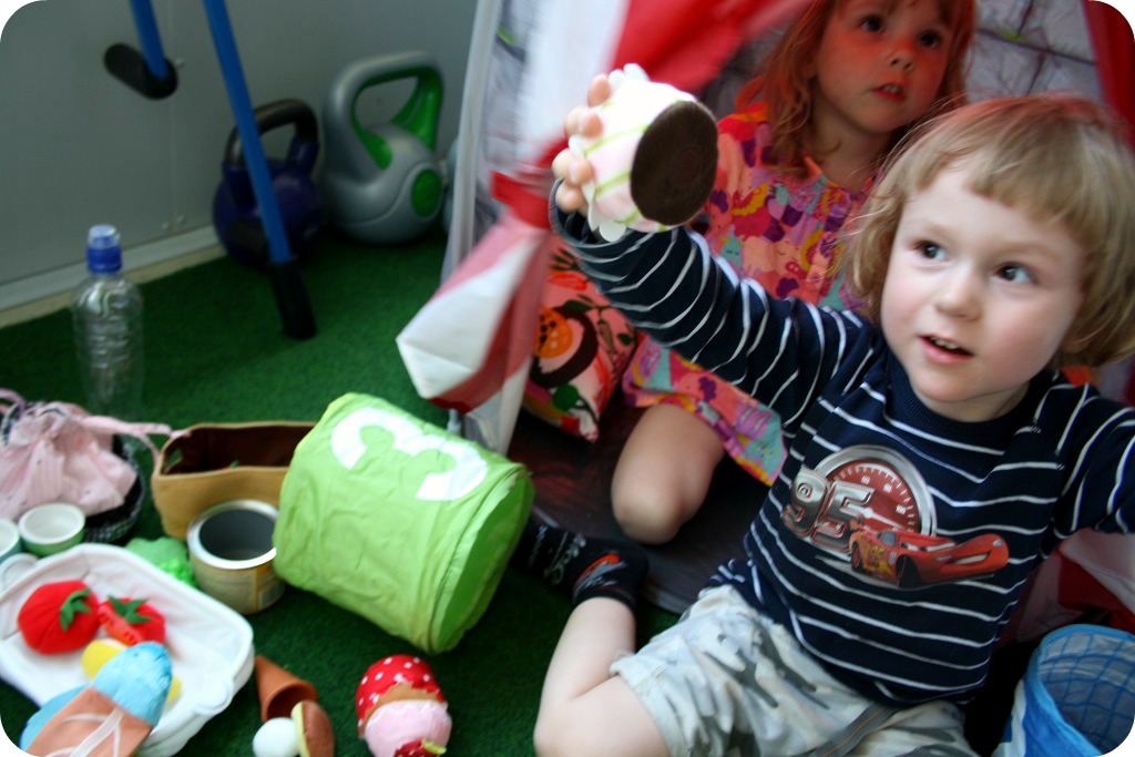 De senaste dagarnas tiptop-väder har bjudit på mycket utelek. Det har varit många skratt och plast vid en närbelägen strand/fontän, lek ute på gården, men även stunder då alla tre samsas och leker inne. Jag skaffade ett nytt tält från Ikea och placerade det på balkongen. Twinsen skulle absolut sova i det på natten och bäddade ner sig. Jag köpte också en massa mjukisgrönsaker och en liten bondgård, som varit i flitig användning. I dagens värld med så mycket plast, är det skönt med mjuka tygsaker ibland också. Det är som de säger i Hemtex-reklamen; tänk va lite tyg kan åstadkomma.