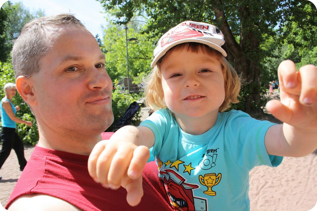 Det är roligt när ungarna kan få vara ute mycket och man inte behöver mycket kläder. Vi hänger i Kuppisparken, med sällskap av fammo. Det är bra att vara tre vuxna, för en unge vill hit, en annan dit.
