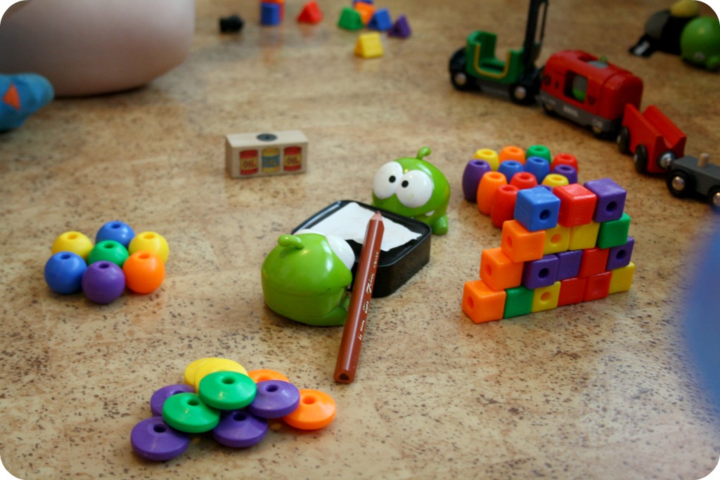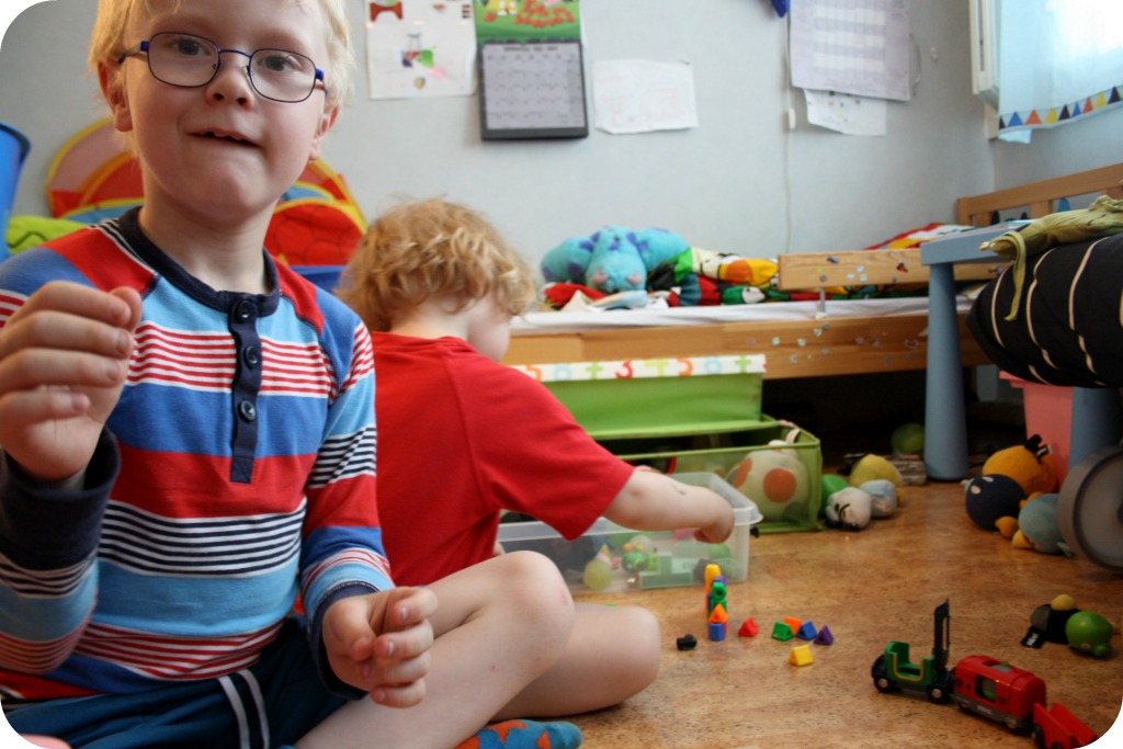 Ungarna är glada, för det mesta. Och slåss om små plastpluppar de fick av mommo. En vill leka affär, den andra vill inkluda dem i stora byggnader.