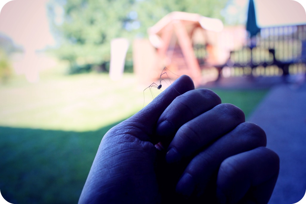 Ute på landet har vi fått en massa extrabesökare i år också. Spindlarna frodas och sen kom det en massa, svarta skalbaggar, både inomhus och utomhus. De klamrar sig liksom fast vid saker och är lite äckliga. Men den här lilla Tripi-trippen jag har på handen, den killade mest.