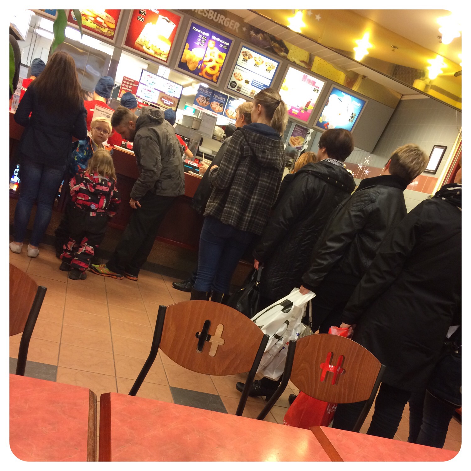 Nåja, vi och ungefär tusen andra hade tänkt samma sak. Vi kom ingenvart på vare sig Taco bar, Rico eller Rosso och det vimlade av folk. Så vi hamnade på Hese. Nåja, kidsen var glada, de fick glass och burgare och jag försöker att inte bara äta skärpmat, så jag fick sallad med burgaren. 🙂