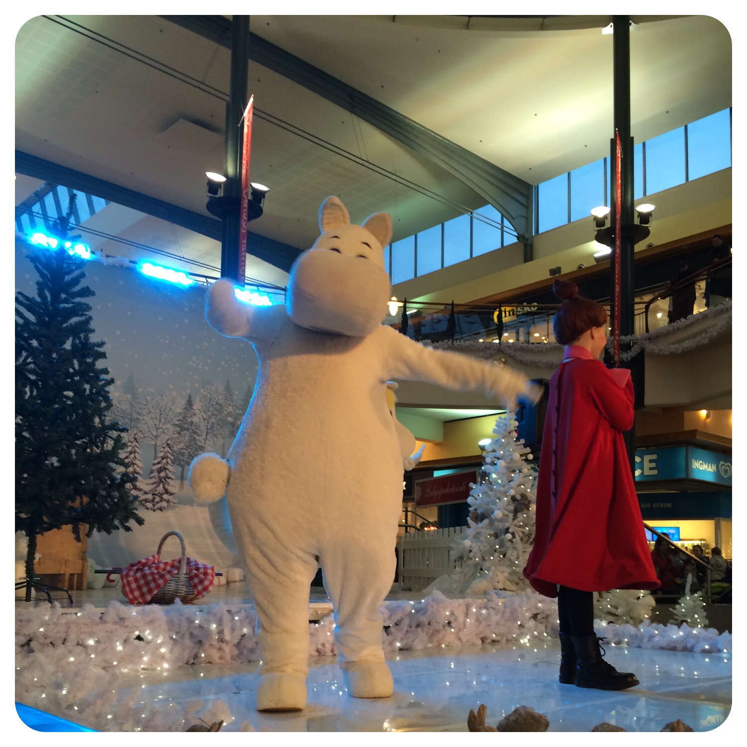 Vi visste inte om att det skulle vara nån show med Mumin idag, men blev glatt överraskade av det. Det blev inte Milja! Hon skrek och grät och hoppade upp i famnen på pappa! Musik på halvhög volym och stora figurer fick mig att få en flashback till då jag var med Wili på Muminland och han bara sprang ifrån mig. På den tiden hade jag också sämre tålamod och sämre förståelse för hur jag skulle handlas med såna situationer. Idag fick vi helt enkelt gå hem, fast via BR. Vi köpte nya tuschpennor.