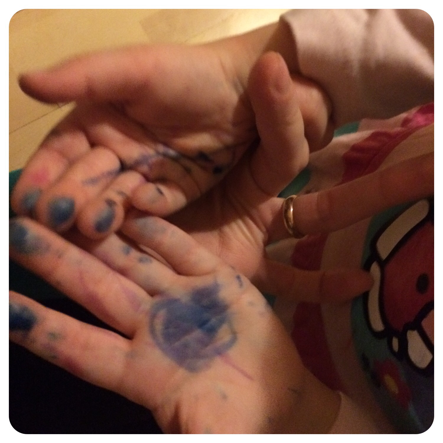 Och det var ju ett misstag! Milja ritade på händerna och i ansiktet så fick bada henne för att få bort allt. Sen grät hon länge över det faktum att hon ritat sig på handen (med flit) men det gick inte helt bort.