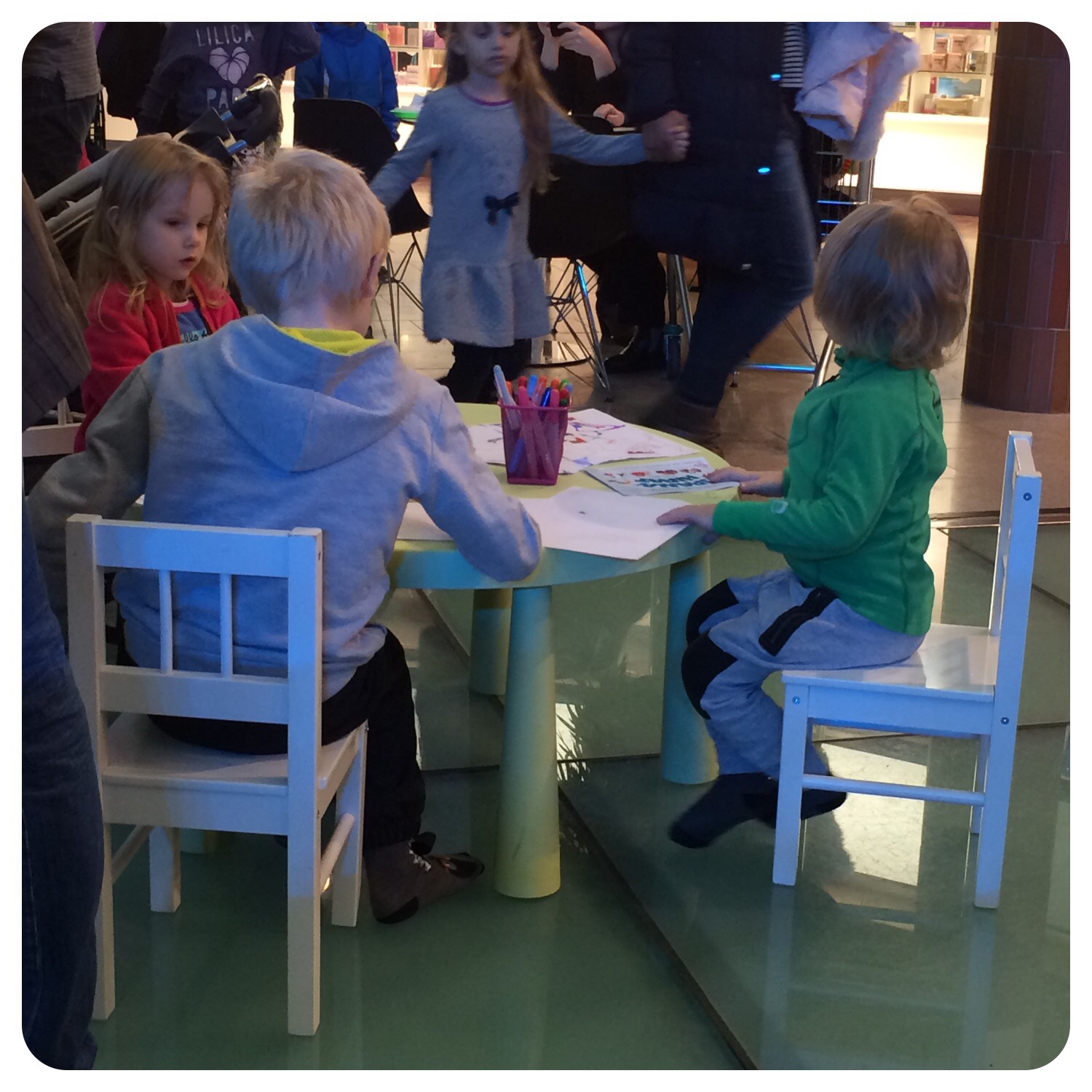 Vi gick ner en våning för att leka vid Muminparken och tyckte det gick bra. Det ritades och lektes… Men så tappade vi bort Isaac! Nåväl, ingen fara å färde, vi hade ju två barn kvar (man freakar liksom lite mindre då) men jag började fundera om han stod och grät efter oss nånstans. Nepp! En stund senare hittade vi honom sittande i en sån där bil man sätter pengar i, där satt han och rattade glatt. Pust.